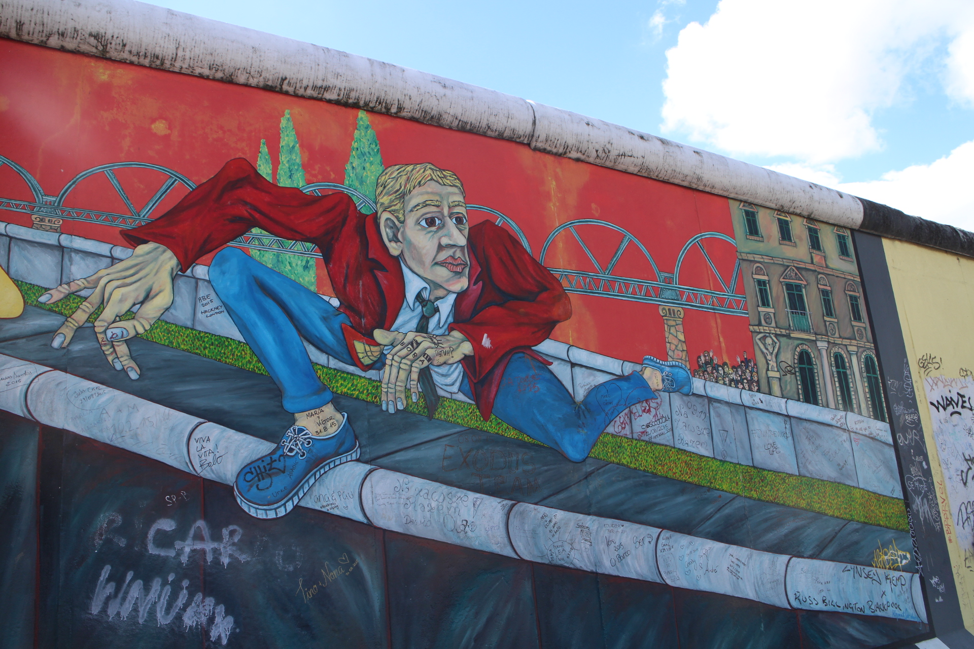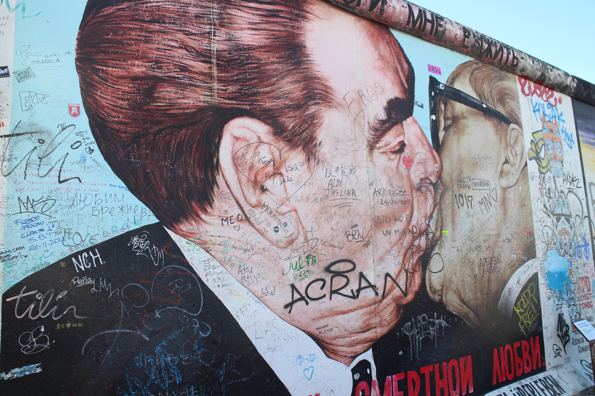 Our first stop was to see the East Side Gallery in Muhlenstrasse, which is the longest remaining stretch of the Berlin Wall and where after its fall artists created the worlds largest open air collection of murals. It’s a shame that graffiti and tourists’ signatures have marred many of them, but it’s still quite a sight to see with around 100 paintings of varying types including a painting of the famous Brezhnev kiss with Erich Honeckev, the then leader of the German Democratic Party.