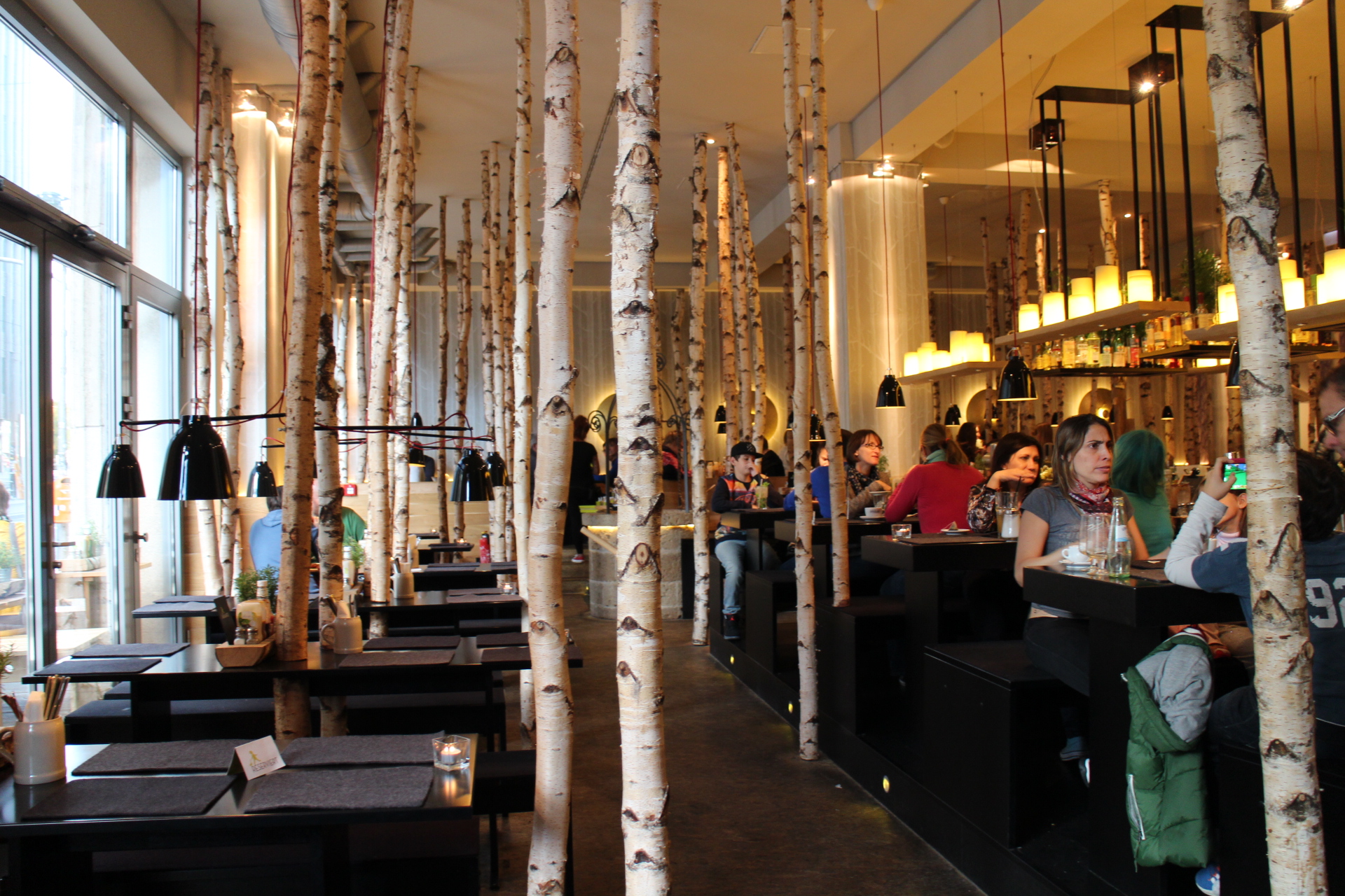 Our final meal of the trip was just along the road from the hotel in Friedrichstrasse. We’d walked passed Hans im glueck burgergrille a few times and the fact it is filled with silver birch tree trunks caught our collective eyes. The condiment holders are made of trunks too and wooden bird boxes cover the wall lights.