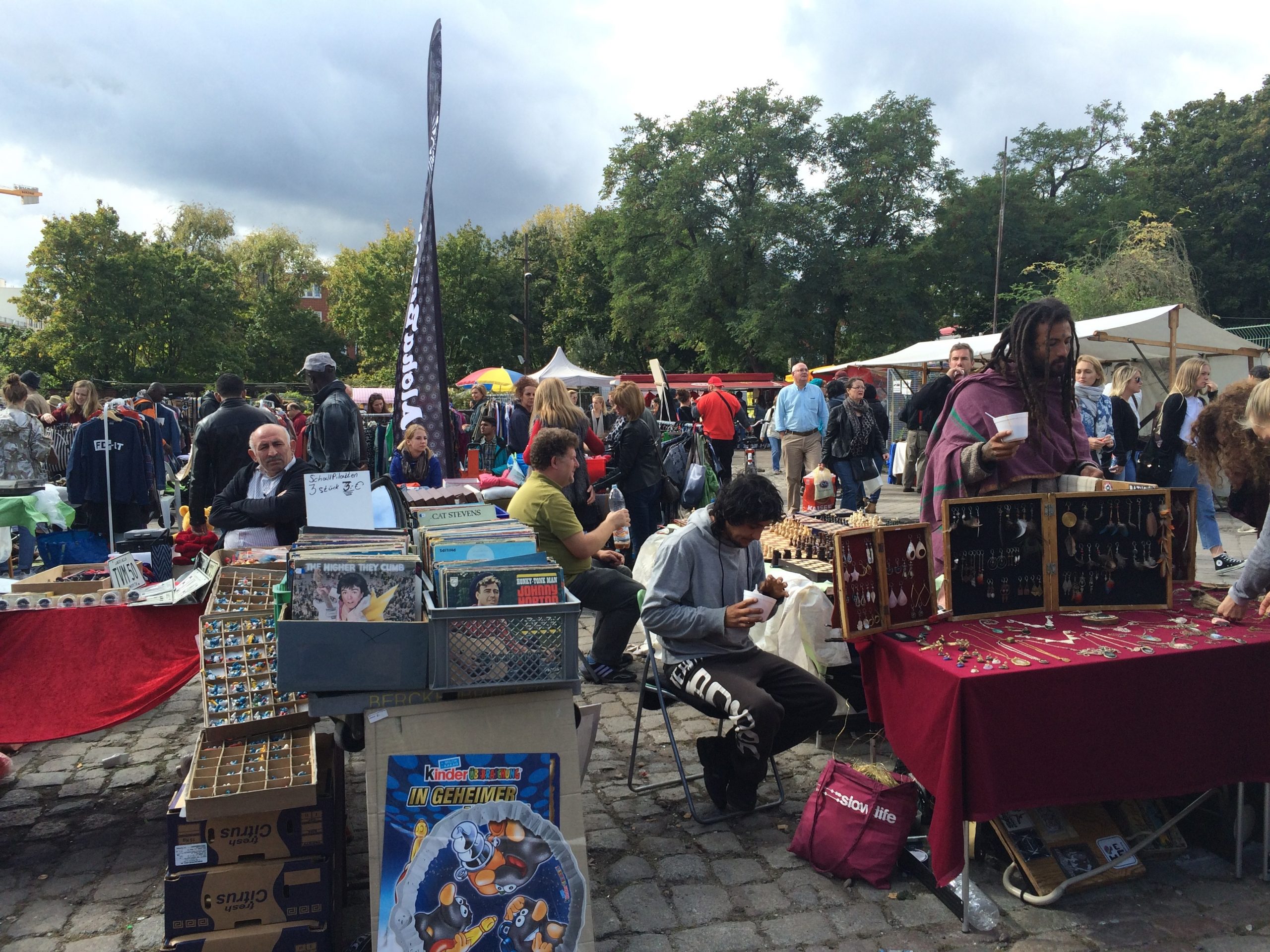 If you keep walking up Bernauer Strasse for 10 minutes or so you come to Mauerpark which was created from a section of the wall. On Saturdays there’s a farmers market and on Sundays a huge flea market selling bric a brac, clothing, crafts, art and food.