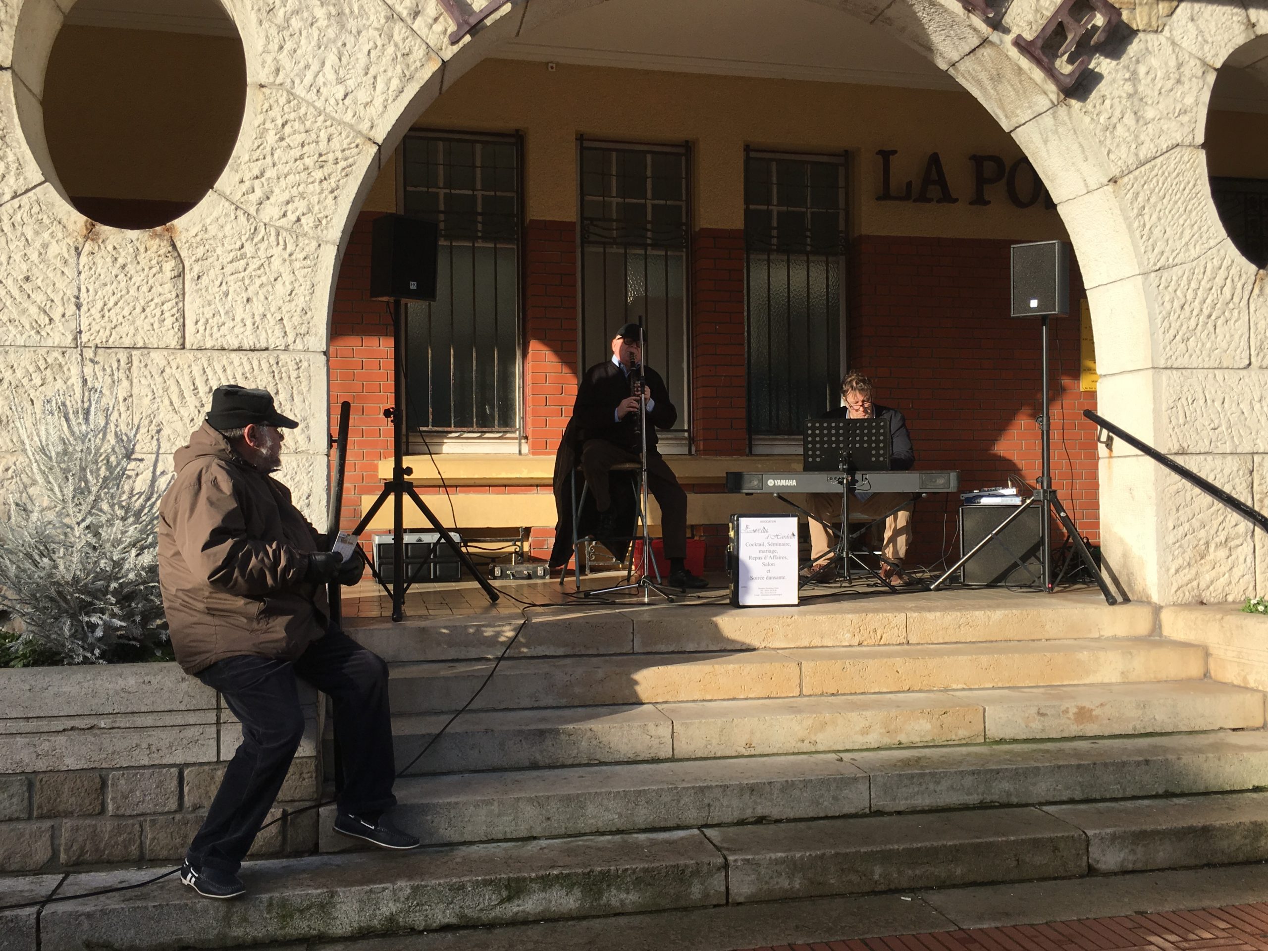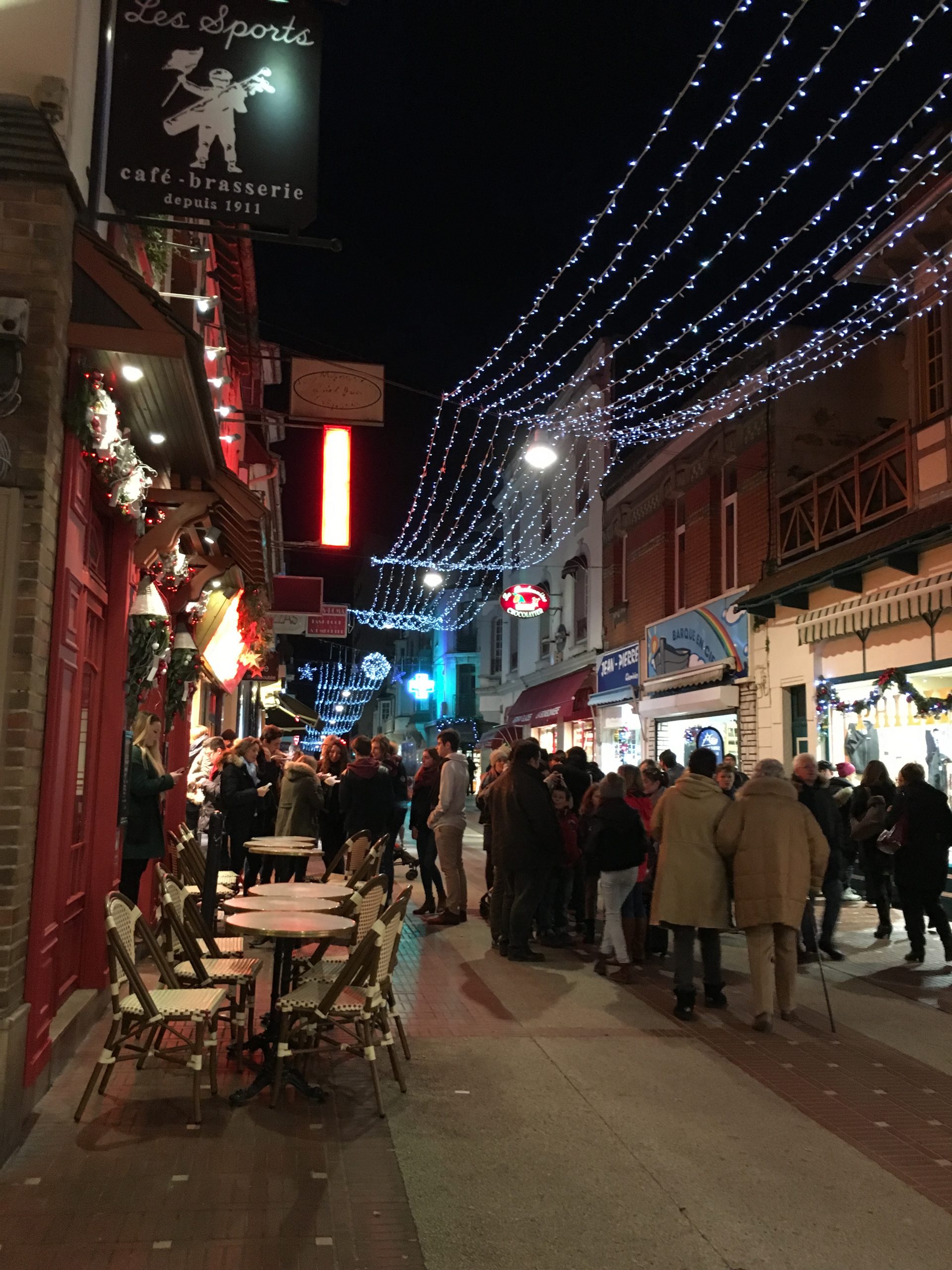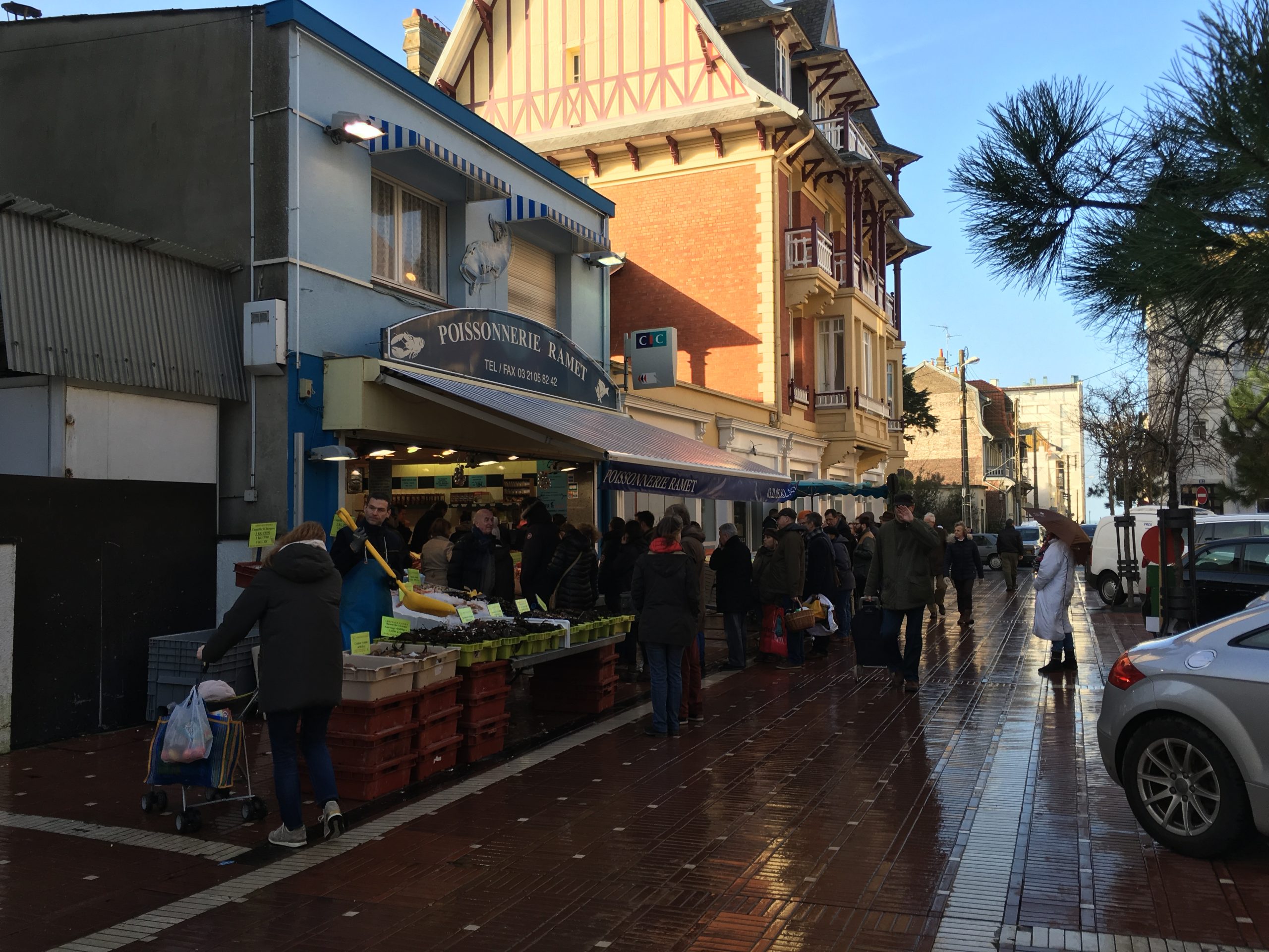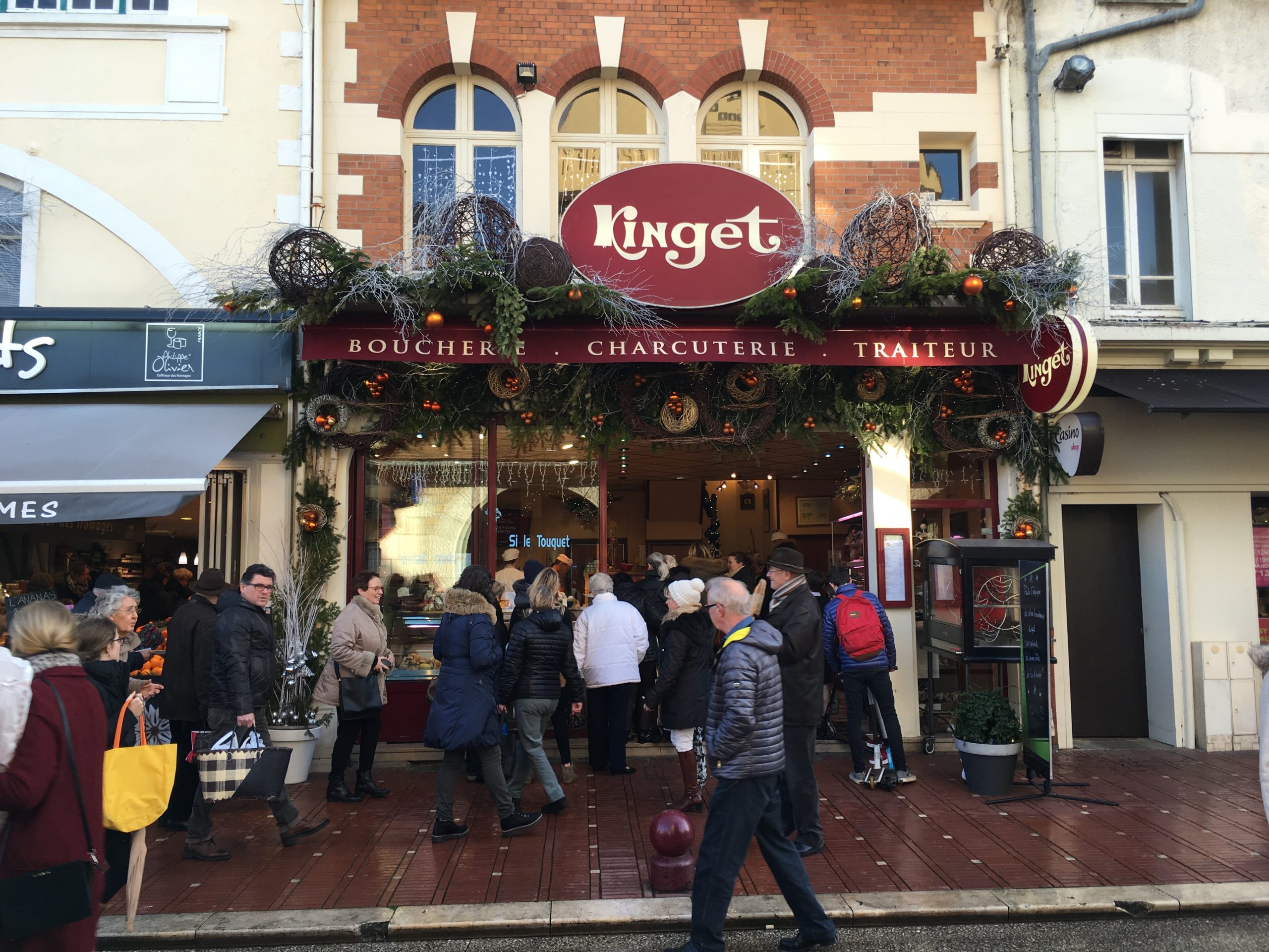 Local Le Touquet residents, and presumably visitors who’d rented homes for the holidays, queued patiently outside every one of them collecting their New Year’s Eve dinners. Nearby, outside the post office, a pianist accompanied a clarinet player to entertain the waiting crowd.