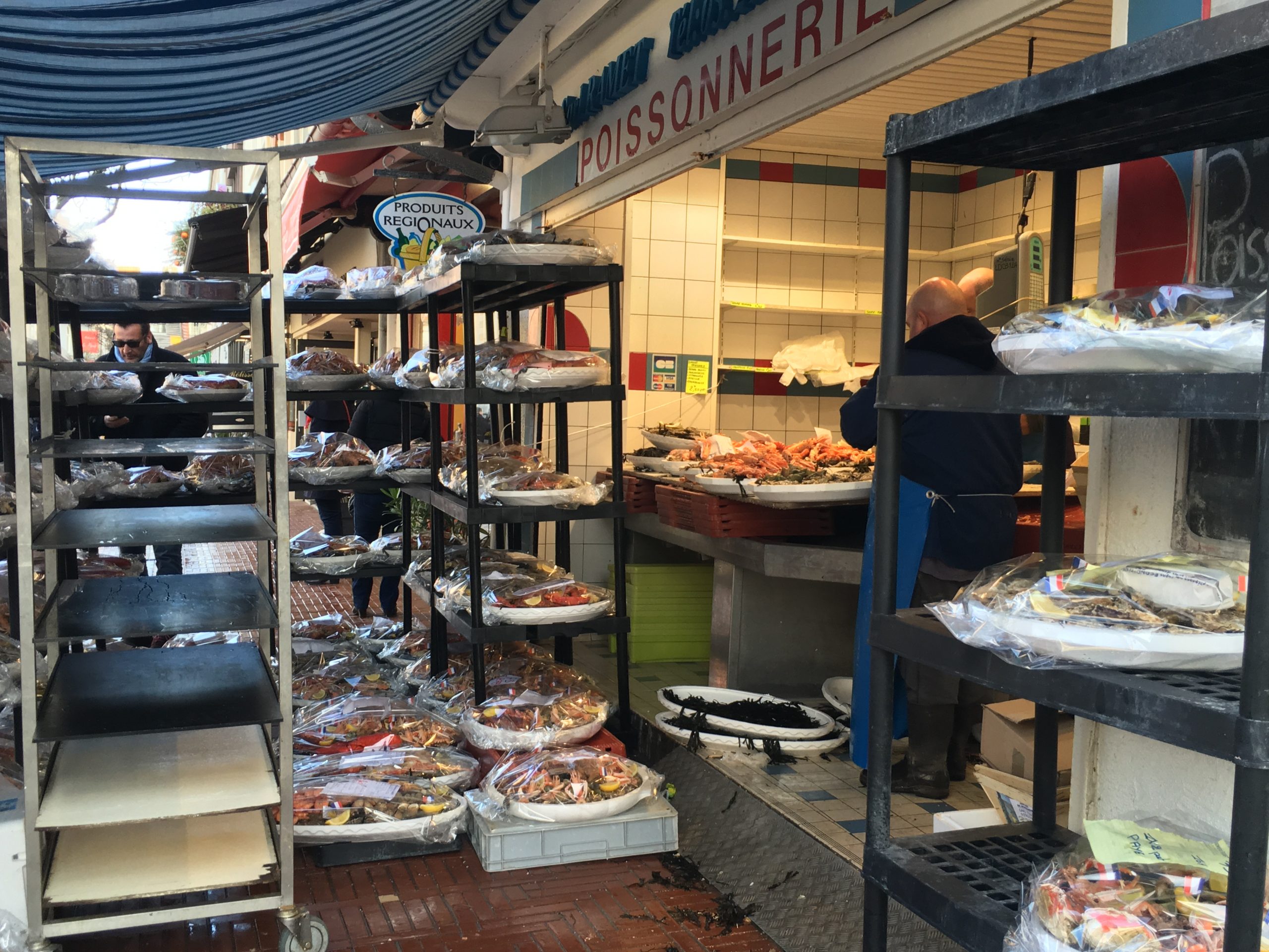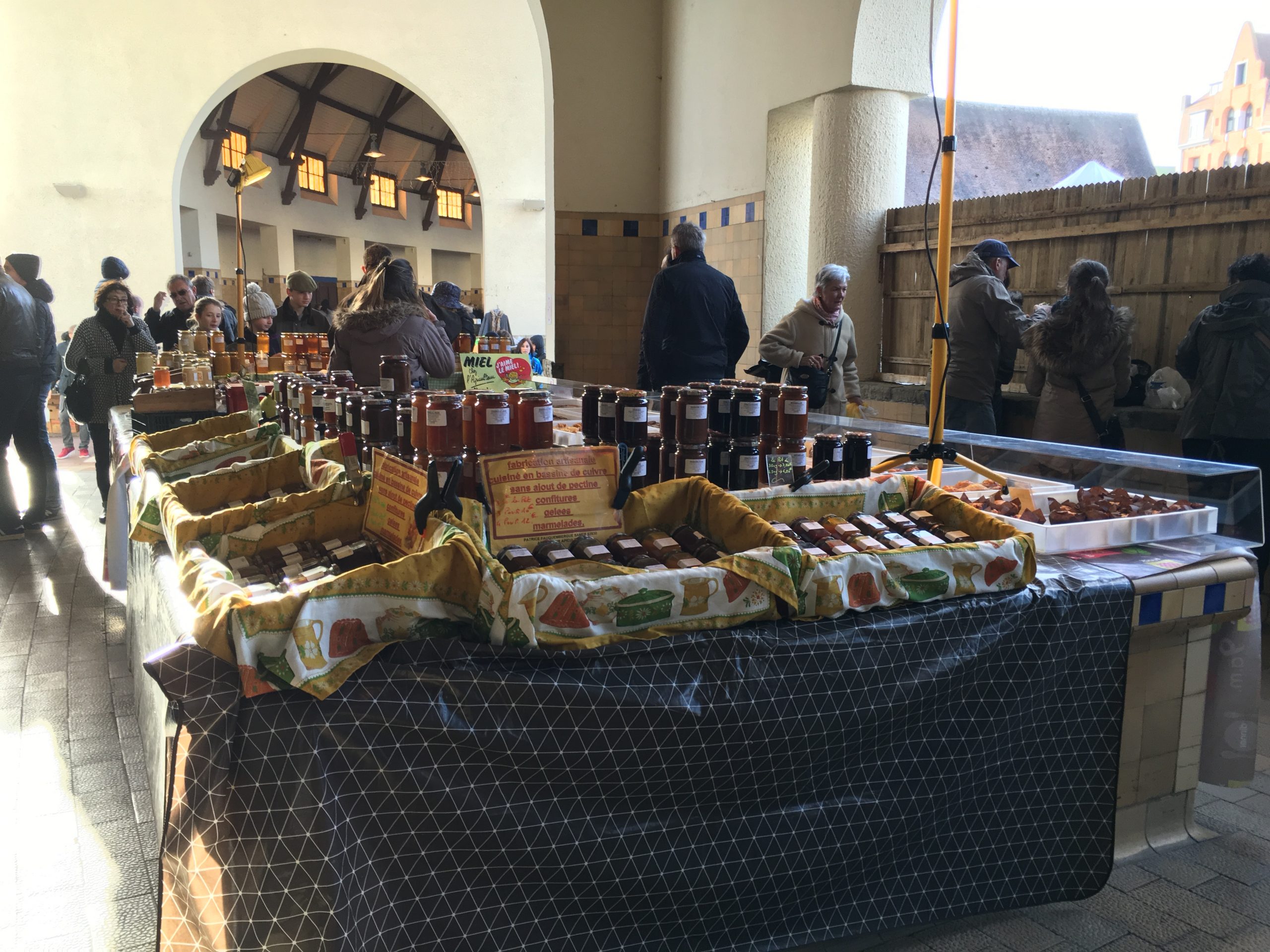 When we reach Rue Jean Monnet we came to the Le Touquet town market. Dozens of stalls, some under cover and some outdoors, were piled high with fruit, olives, cheese, clothes, wicker baskets and of course more seafood. It doesn’t open every day but I think on Tuesday and Saturday mornings and Thursdays too in the summer months. The tourist office has a website with info like this which Google helpfully offers to translate.