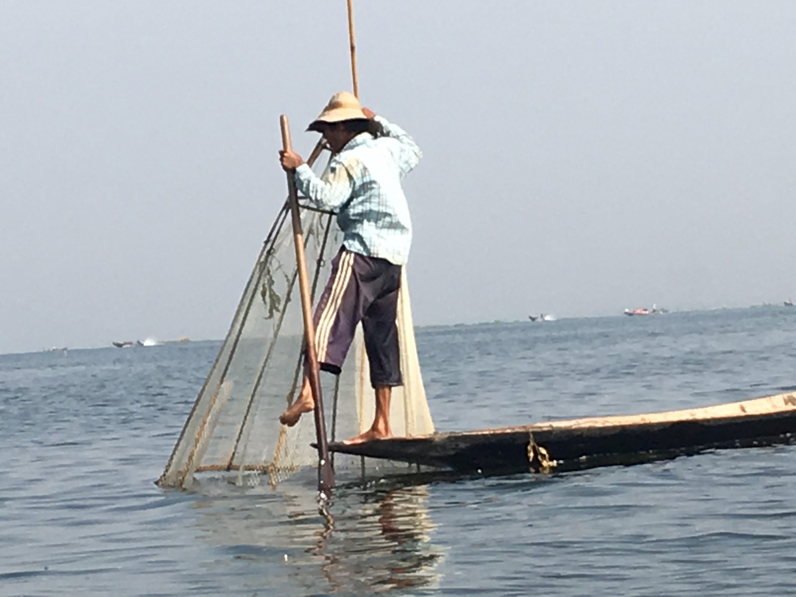 The other main activity on the lake is fishing and there are plenty of fishermen going about their business, though some do it overnight when it’s quieter. They use an interesting net with a bamboo pole in the middle. They watch for bubbles, poke around with the pole to check a fish is there and if it is drop the net and push the fish into the edge of it. Our guide tried to demonstrate but it’s clearly a skilled job. They are also famous for rowing with their legs instead of arms and that looks pretty tricky to do too.