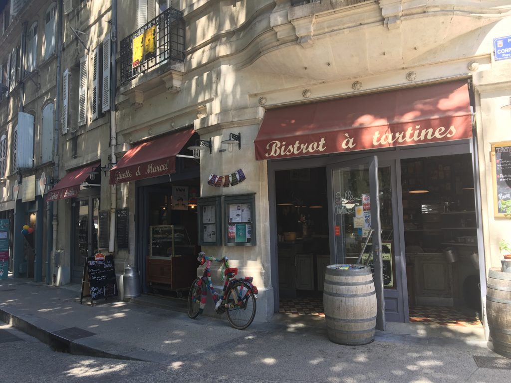 AvignonThere are lots of places to eat and stacks of alfresco seating in the square, but on a guide book recommendation we went for Ginette et Marcel, a cool vintage cafe styled like a 1950s grocery. The specialty of the house is tartines – open sandwiches that looked and tasted delicious. A perfect light lunch alongside our first Provence rose of the trip. Did I mention we were here for the wine?