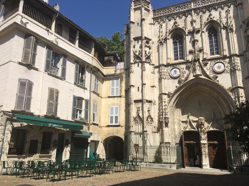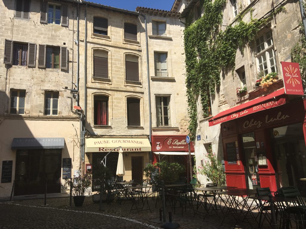 AvignonIt was Sunday, which was actually a really good day to arrive as most of the shops were closed and there were very few cars around. On the recommendation of our hotel manager we strolled through the quiet streets to nearby Place de Corp Saints, a lovely square shaded by plane trees.