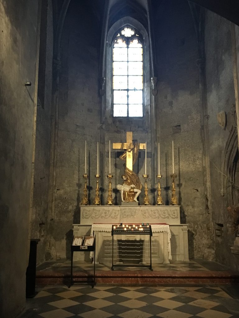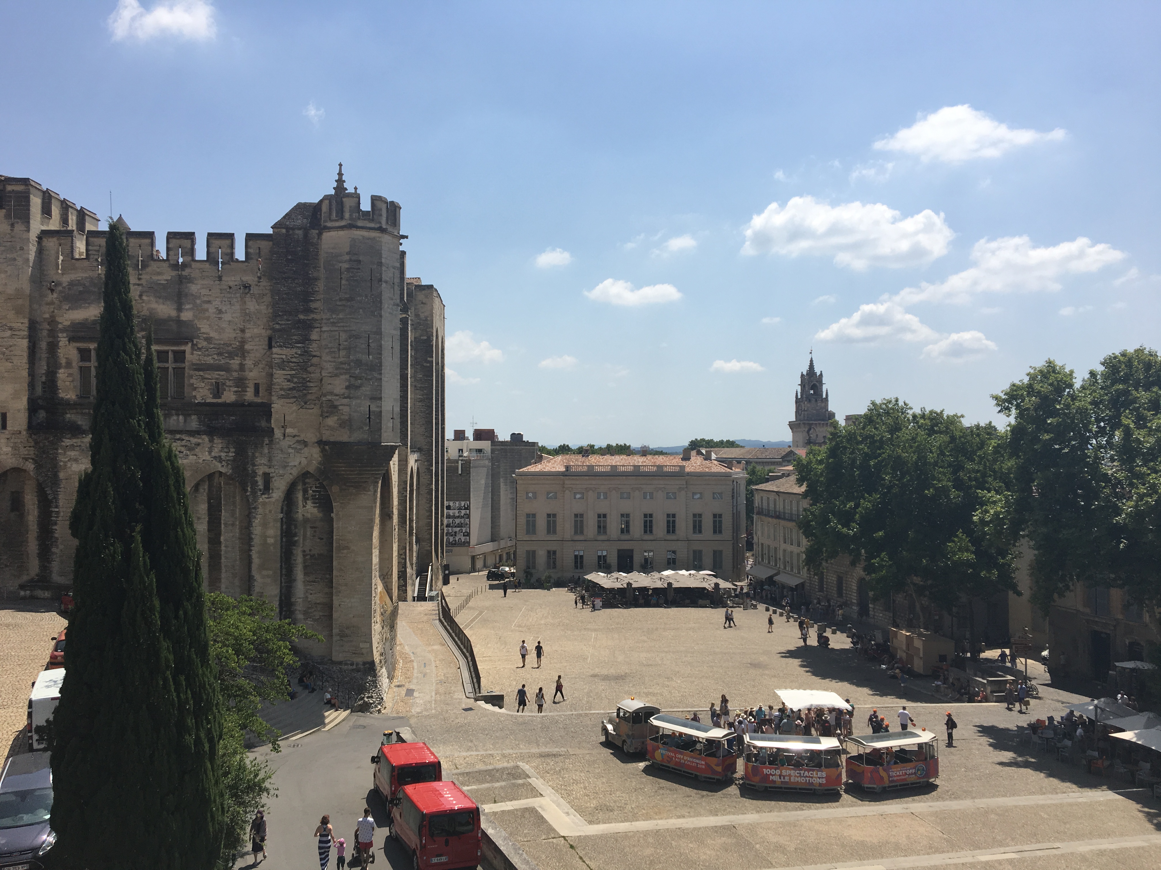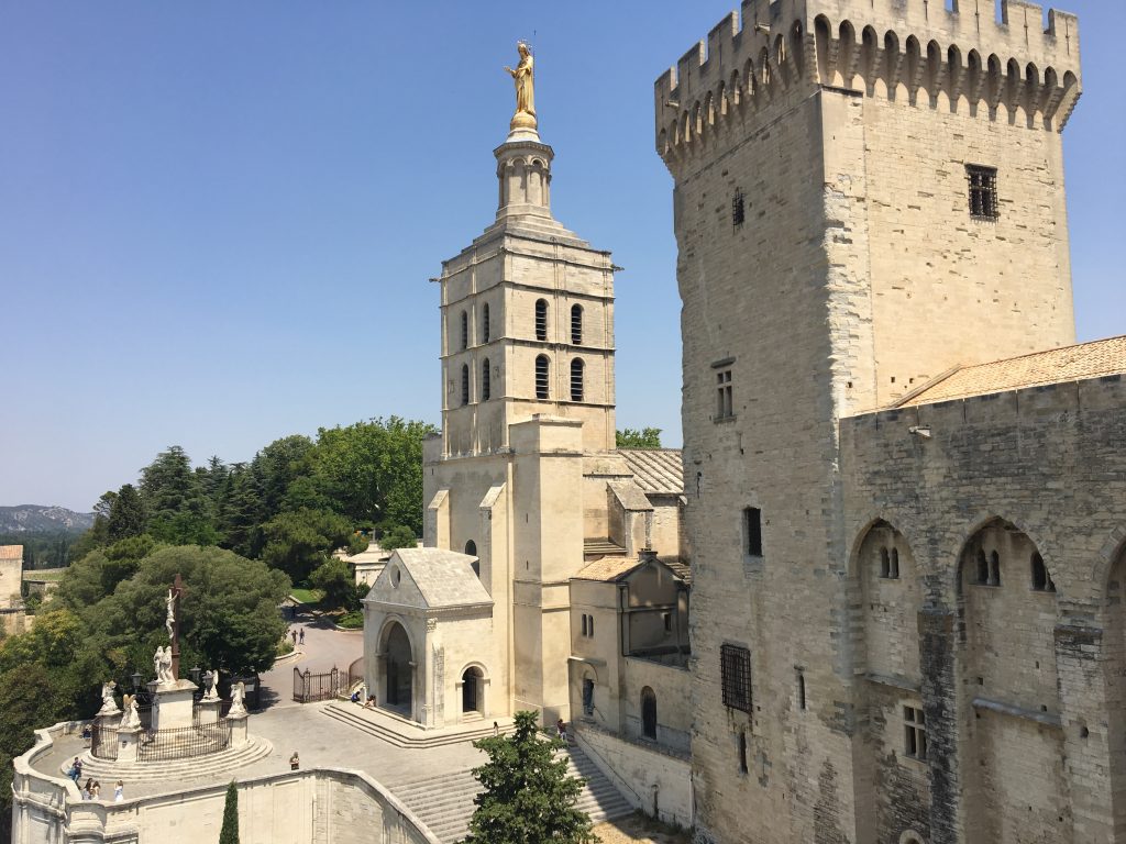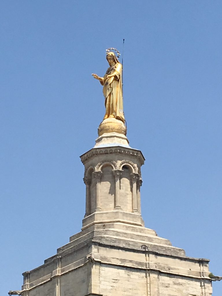 But the best bit is when you go into a room with a time portal. Hold your histopad over it and it cycles back in time to show you visuals of what the room looked like when the popes were in residence. Very cool and clever.AvignonAvignonNext to the palace is Avignon’s Notre Dame des Doms cathedral, the dome of which is topped by a 4.5 tonne gold statue of the Virgin Mary. On the other side of the square, Place du Palais, is the former mint, Hotel des Monnaies, which has some wonderful carvings of fruit and animals.AvignonJust behind the cathedral is the hilltop Rocher des Doms gardens which was a key location in the early part of my book and really reminded us of the hilltop parks in Santiago. Perfect for a quiet walk above the city and with great views of the Rhone river and that famous bridge.