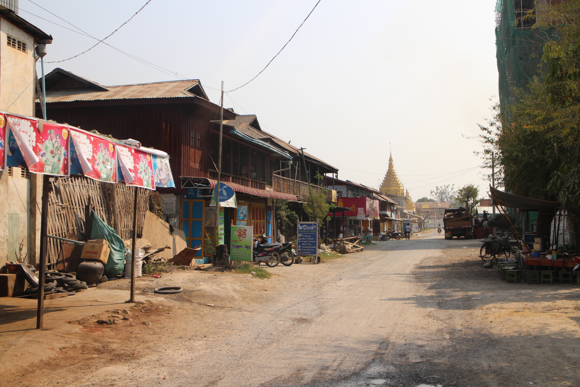 We didn’t turn straight into the walkway to the temple, Shwe Inn Thein, but meandered a bit more around the village cutting into it further up. Thank goodness we did as it must have been the longest temple corridor yet and was lined with dozens of stalls. Not long after we ducked out of it again and were almost immediately rewarded with the sight of dozens of ruined stupas tightly packed together. By now we’d seen many a stupa in Myanmar but nothing quite like this.