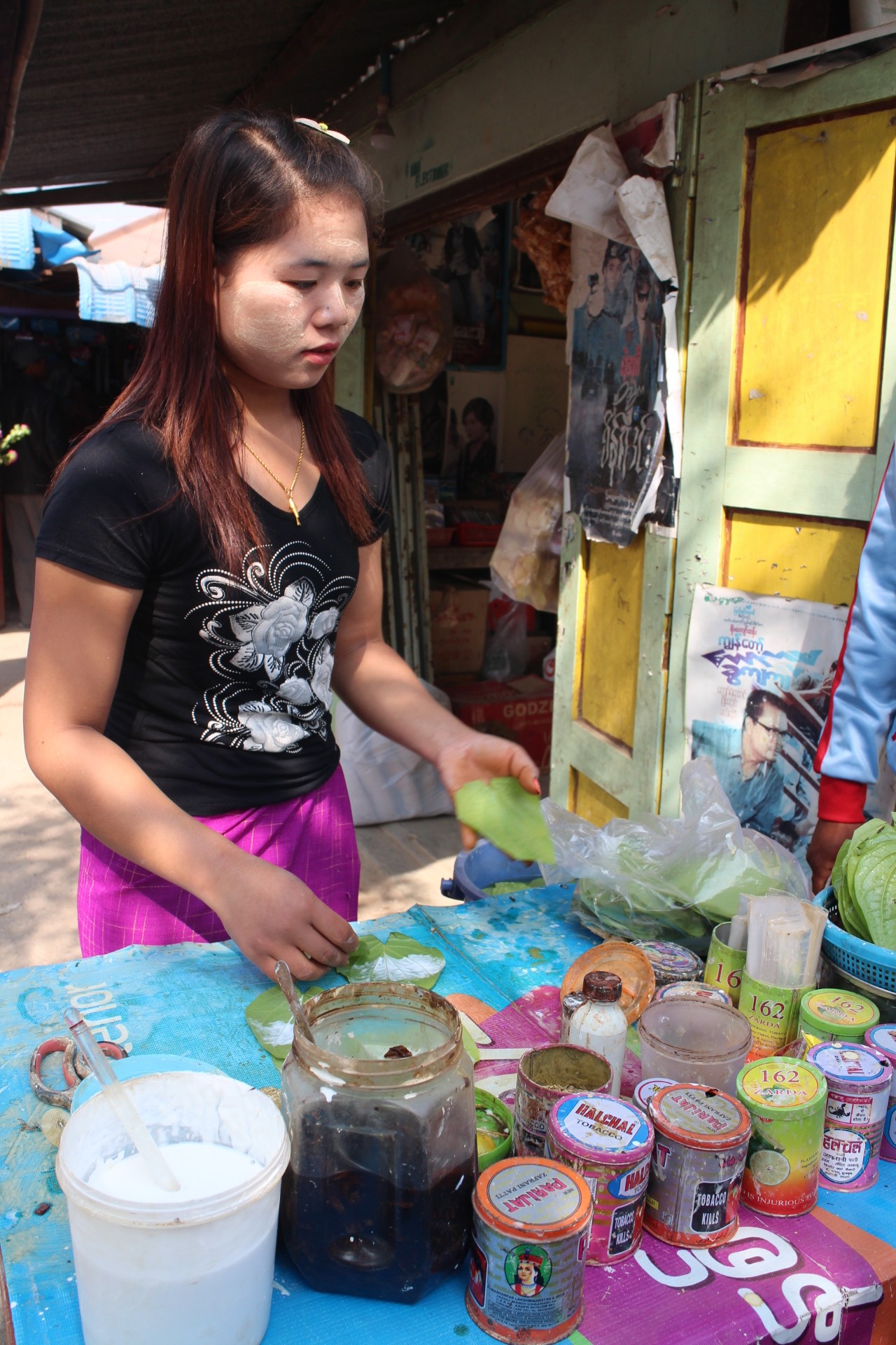 At Indein it was much busier with lots of boats and families living in and around the dock. We walked up to the village temple passing various stalls and bought some mini couples, a traditional hot snack known as the husband and wife. It’s a bit like a dumpling with spring onion and peas inside and very tasty. Other stalls were mostly selling the usual souvenir stuff, but I succumbed to a small oil painting of monks as the young female artist was sitting behind the stall working hard on the next one.