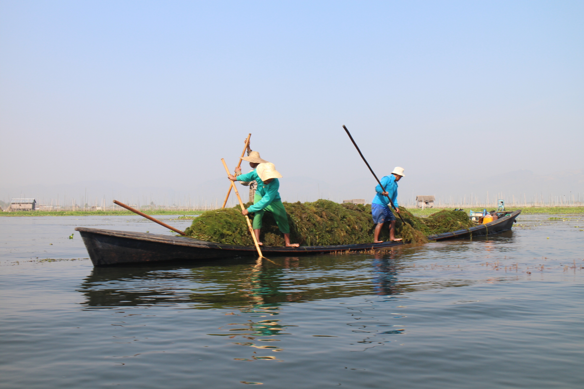 Each garden is separated by a narrow channel of water and every farmer has a hut or two on stilts which are basically their sheds. If you spot the occasional blue hut its the Department of Irrigation checking the farmers don’t encroach further into lake. The beds occur naturally but farmers prepare them over a period of time joining strips together to make a sort of floating ‘field’ and can use them for 20-25 years. Seaweed is also regularly collected from the lake and piled onto boats to take to the gardens and use for fertiliser.