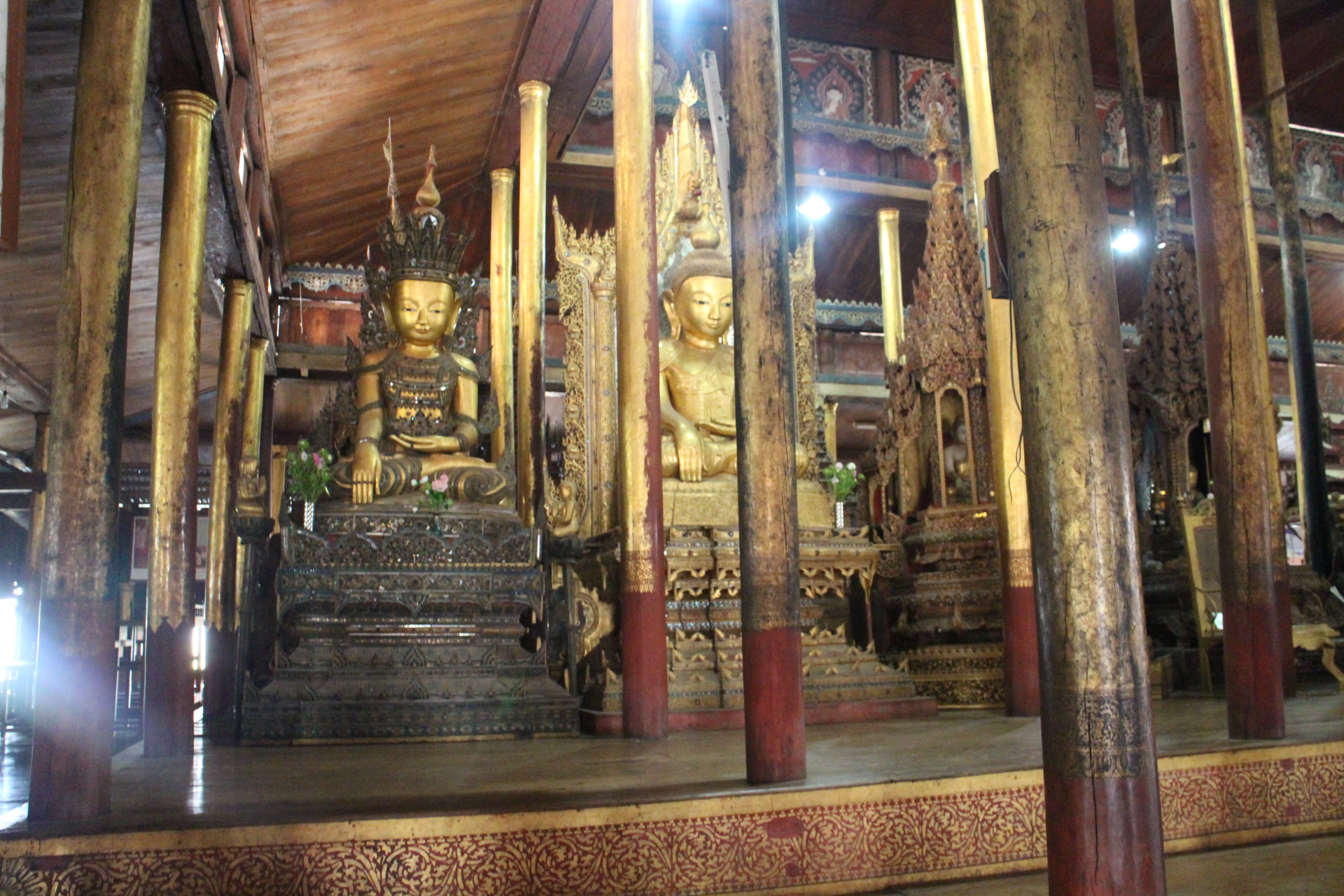 As well as people to meet, there were also places to see at Inle Lake and Nga Hpe Kyaung is one that’s worth hopping off the boat for. It was known as the jumping cat monastery as when not meditating the monks trained their cats to jump. That doesn’t happen now, there are just 10 cats and 8 monks living quietly in the teak building though novices do come in the summer. What’s most interesting is all of the different styles of ancient Buddha images displayed on pedestals in the meditation hall.