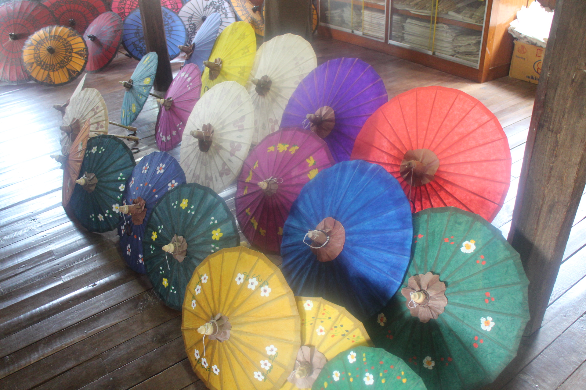 What is does have is lots of cottage industries. We went to the umbrella workshop where they make what we would call parasols from Shan paper. It’s a fascinating labour intensive process using bark from a mulberry tree which is boiled and mashed into pulp and then spread onto a fabric frame and mixed with water. It’s left to dry and then the pattern is added, pressed flowers for example, then stripped off the frame. The finished paper moves inside where a woman is painstakingly attaching it to the bamboo spokes that have also been made at the workshop. She skilfully cuts the paper to shape keeping off cuts to add decoration to the top of the umbrella.