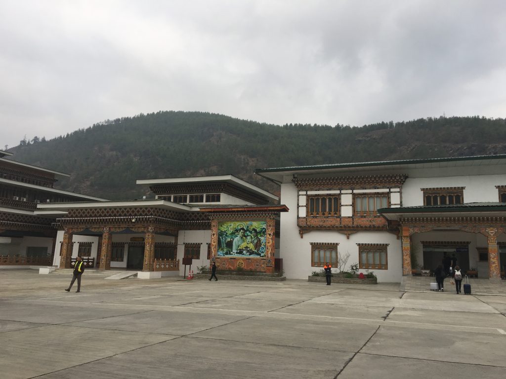 Paro is the only international airport in Bhutan and the landing is quite an experience. Only a handful of pilots can navigate their way down through the mountains – our first glimpse of the eastern Himalayas that Bhutan is nestled amongst. The chief pilot of Druk Air, the Royal Bhutanese airline is the King of Bhutan’s father-in-law. More on the royals later as they feature very prominently throughout the country.