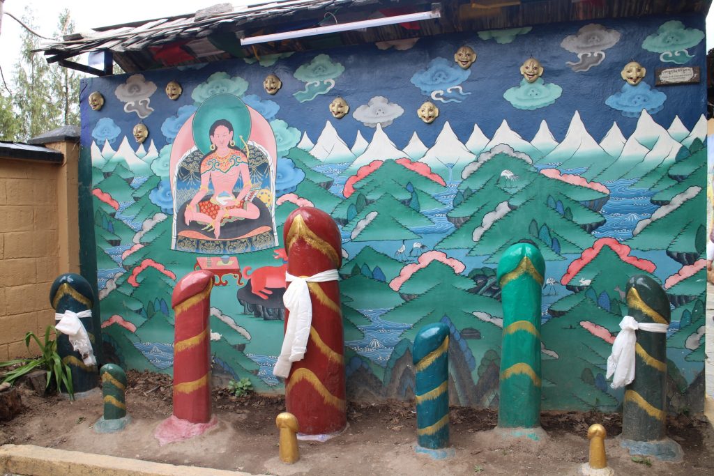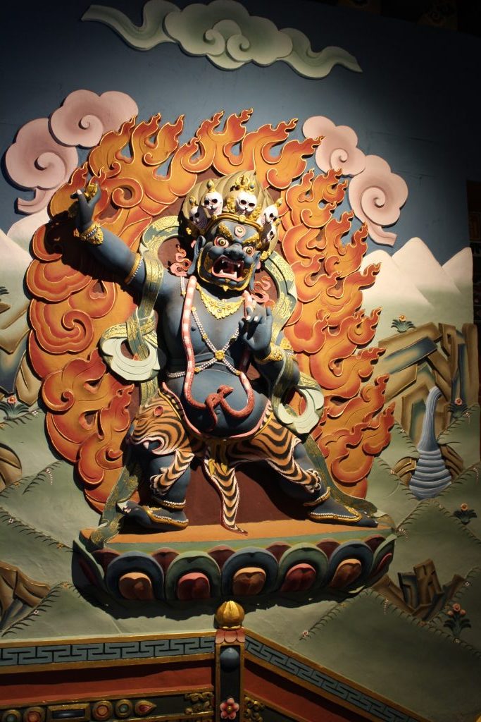 Inside the temple is a riot of colour. The pillars and walls are painted and thick red prayer mats are placed in neat rows. A large statue of the historical Buddha is in the middle sitting in a lotus flower with carved flowers around. To his left is Second Buddha, Guru Rinpoche, who is the Buddha followed by the Bhutanese as is credited with founding Buddhism in Bhutan in the 8th century. Mini Buddhas are in glass cabinets around the walls.