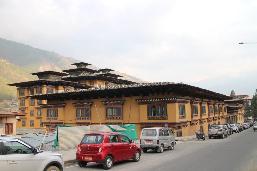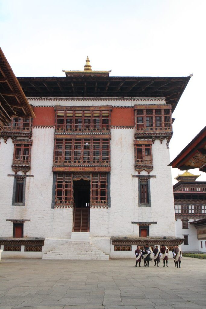 Also in the room are three thrones – for the current Fifth King, his father the Fourth King and the current Je Khenpo, also known as the Chief Abbot and responsible for all Government supported monks. We’d learned earlier that only these three wear a yellow scarf tied around them. Helpful intel when we came across the current King a few days later! Watch out for my post about Punakha for more on this. Not far from the dzong is the King’s residence as well as the impressive building that hosts the National Assembly.
