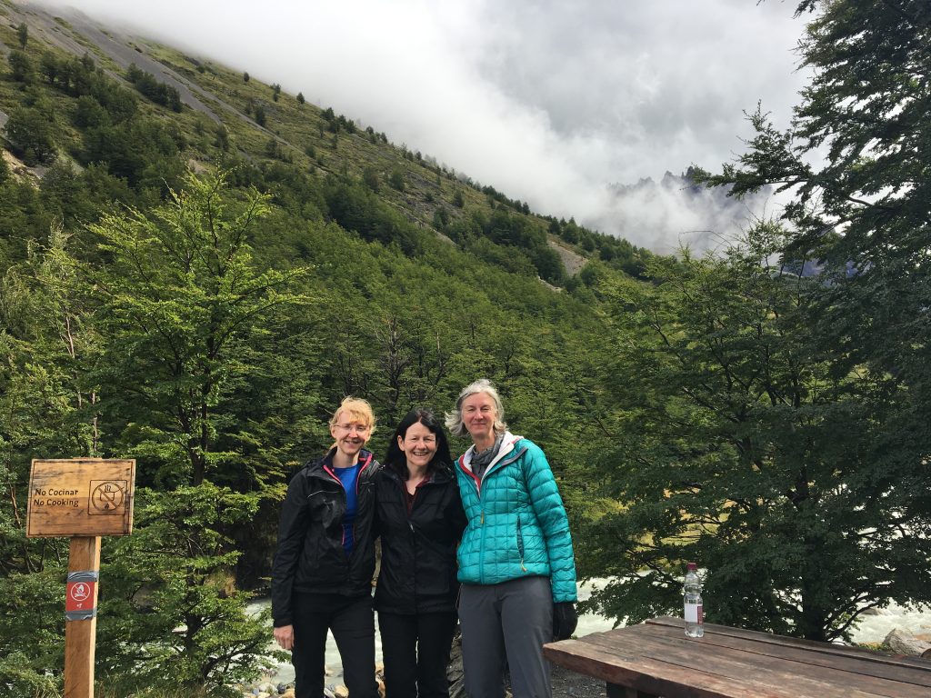 Our guide Trisha had warned us that the first day of our three days of trekking in Chilean Patagonia would be the worst, but I don’t think anyone in our group of six was expecting it to be quite so tough. Not helped at all by the fact that it rained all the way up and quite a bit of the way down. The scenery we’d come for was very misty and our eyes were firmly focused on where we were putting our feet, though we did manage the occasional smile for the camera.