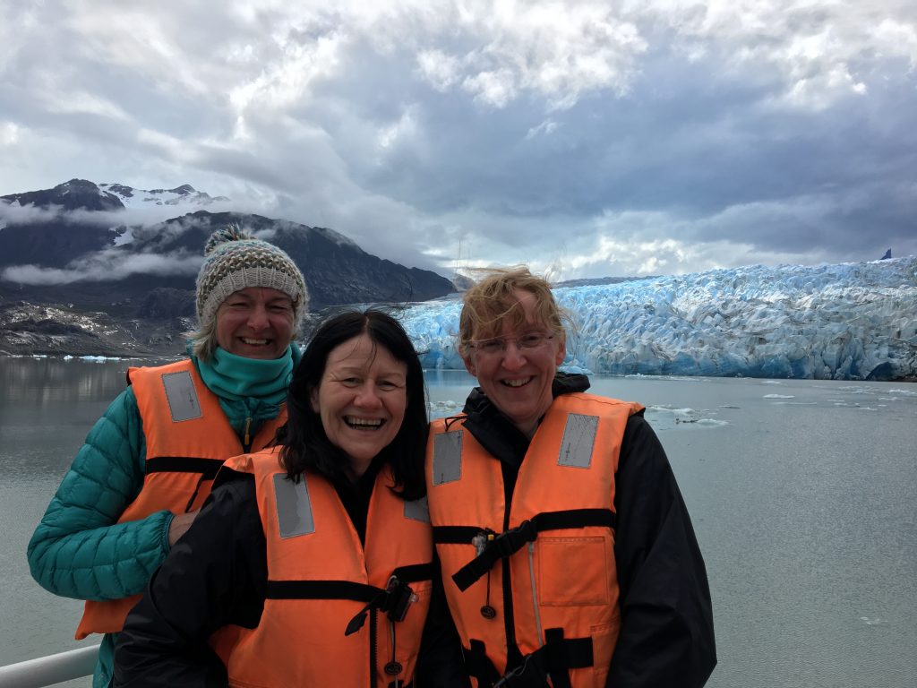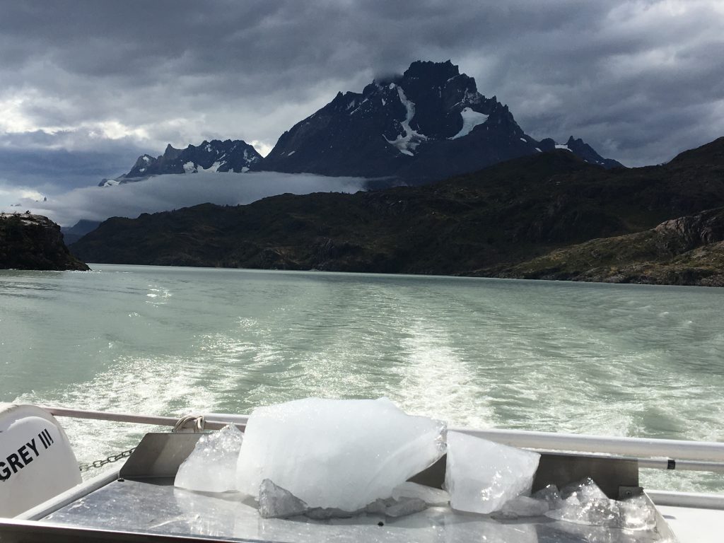 Torres del PaineHorrendous hike forgotten we stayed on deck until the boat was heading away from the glacier and along Grey Lake. Then it was back inside to enjoy Pisco Sours cooled with glacial ice with our lovely group. Maryann, Brian and Jianing had been great people to spend time with and helped us get through the more challenging parts of the hike, even carrying my rucksack to take pressure off my knee.